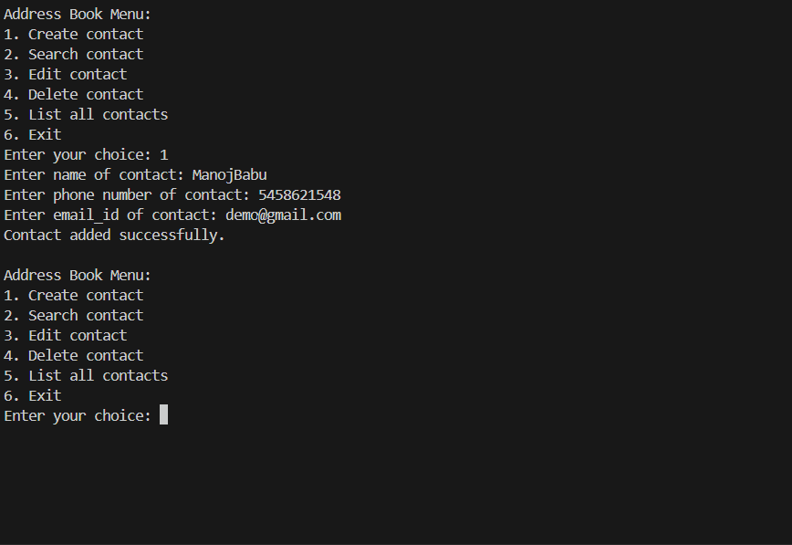 Built a command-line based Address Book application using C, enabling users to store, search, update, and delete contact records. Implemented file handling, dynamic memory allocation, and structured data storage using pointers and structures.