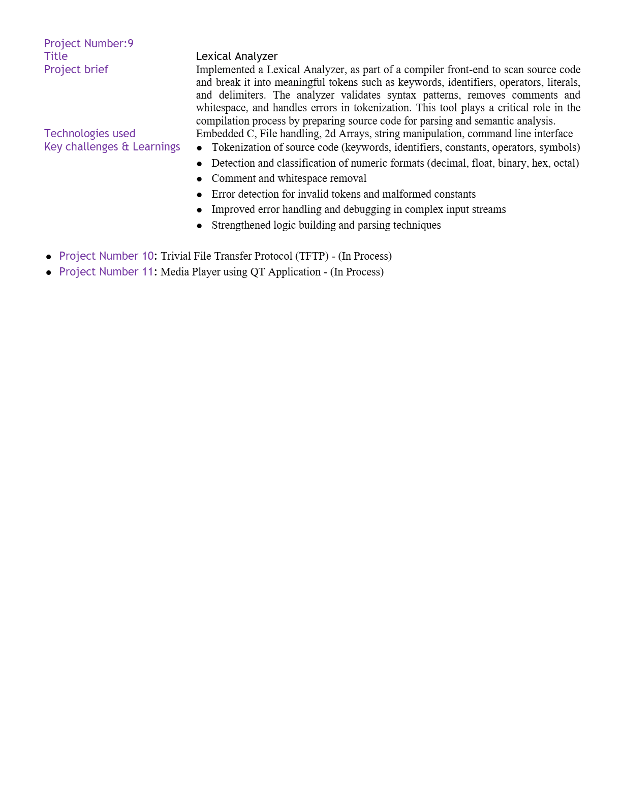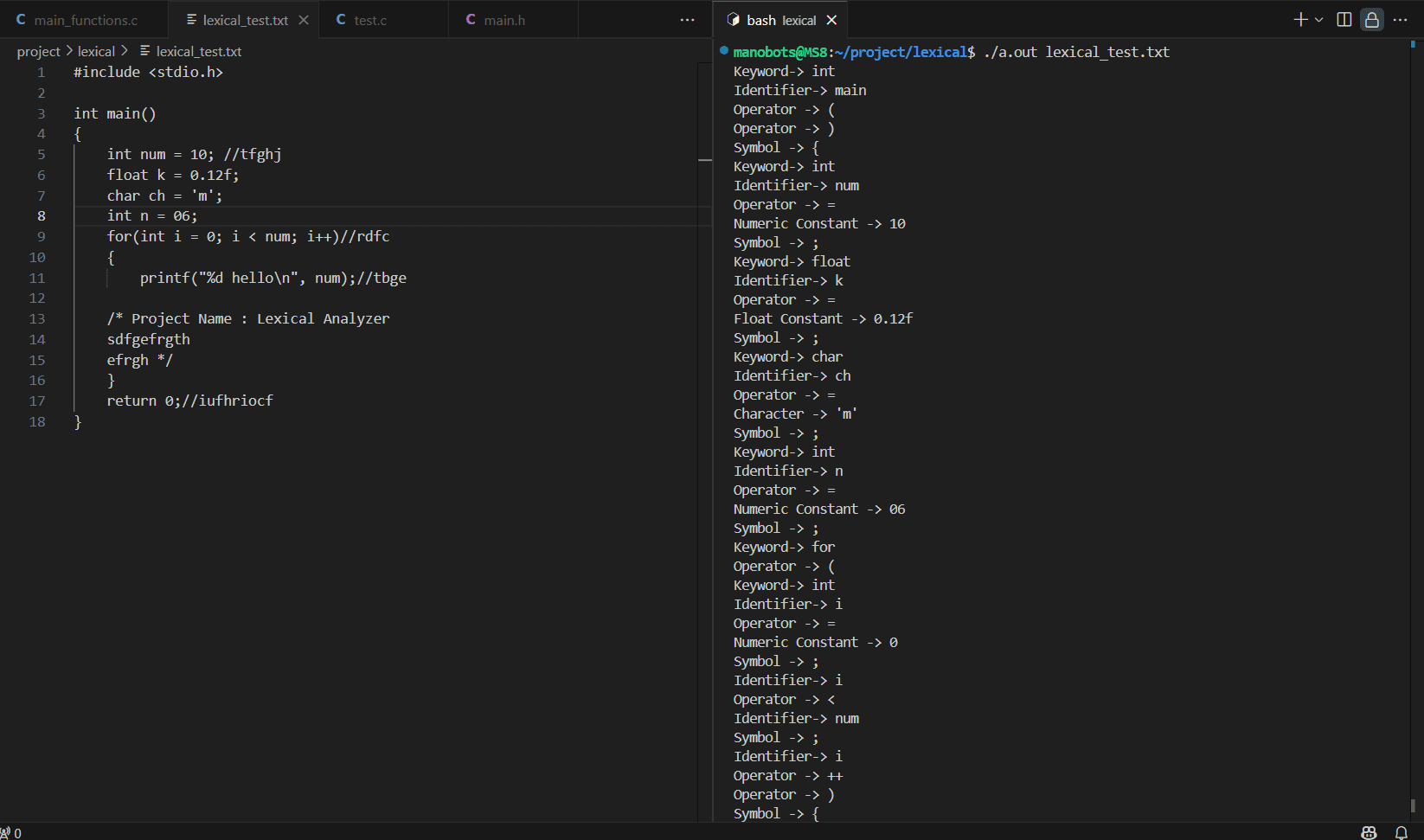 Developed a compiler front-end lexical analyzer that breaks down source code into tokens. Recognized keywords, operators, identifiers, and constants while reporting invalid tokens and formatting errors.