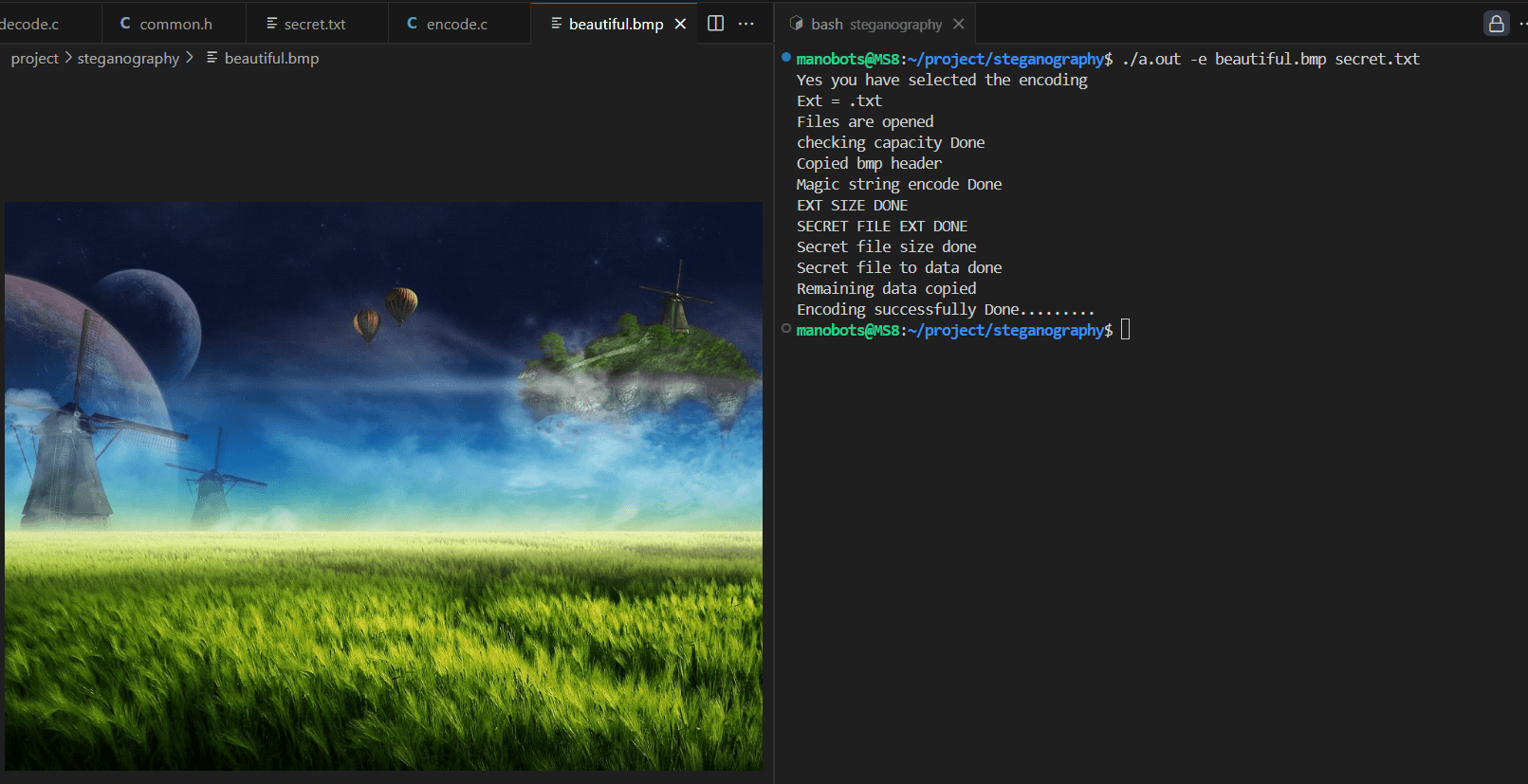 Developed a steganography-based tool to securely embed a secret text file within a BMP image. The implementation involved encoding the length of the text and hiding the message in the least significant bits (LSB) of the image bytes.